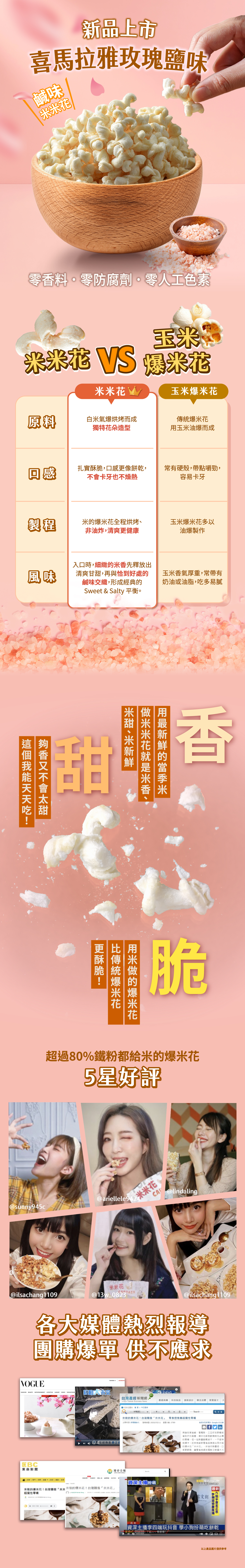 這款非油炸零食採用獨特的米製膨鬆技術,每一口都是綿密且令人驚豔的酥脆。嚴選來自世界高峰的喜馬拉雅玫瑰鹽,細緻溫潤的柔和鹹味,完美提升了米米花本身的淡雅臺灣在地米原香,與海藻糖的輕微甜美交織出層次豐富、百吃不厭的鹹甜滋味。