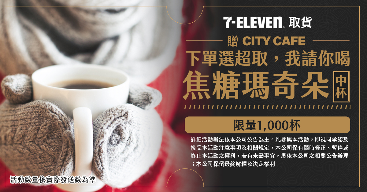 於活動時間內 ( 2021 年 12 月 6 日起至 2022 年 1 月 9 日止 ) 完成下訂並於 2022 年 2 月 6 日 23:59 前在 7-ELEVEN 完成取件者,即享有獲取資格 ( CITY CAFE 熱太妃焦糖風味瑪奇朵 中杯 ),贈送對象將於 2022 年 2 月 10 日起至 2022 年 2 月 20 日止依實際完成取貨順序發放,因數量有限,如未獲贈不另通知。