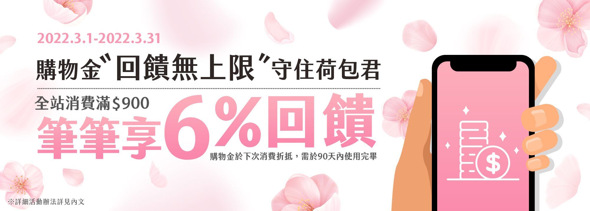 官網全站消費滿$900,筆筆享6%購物金回饋!